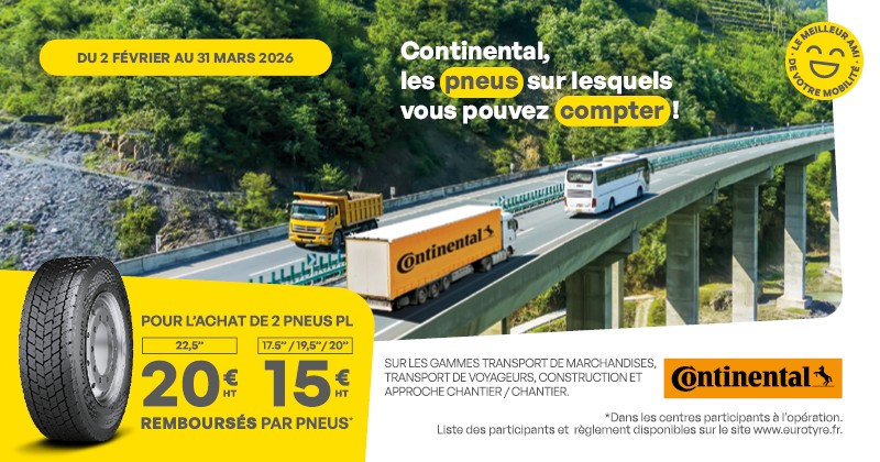 Du 2 février au 31 mars 2026, pour l’achat de 2 pneus poids lourds profitez de 20€ HT remboursés par pneus pour la dimension 22,5″ et 15€ HT remboursés par pneus pour les dimensions 17,5″/19,5″/20″ sur les gammes transport de marchandises, transport de voyageurs, construction et petits poids lourds.